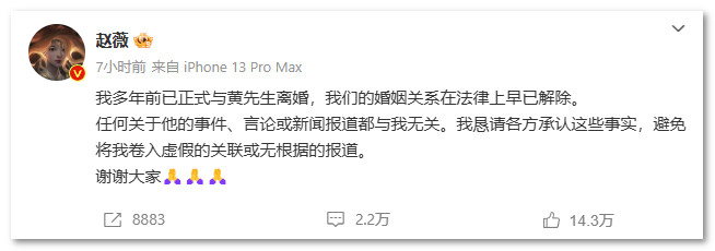 【星岛都市网】赵薇发文官宣和黄有龙离婚,两人08年结婚,多年前已解除婚姻关系。几天前黄有龙再次被卷入追债风波,欠款共计约13.6亿元。