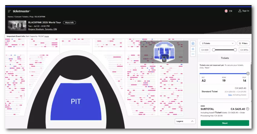 《星岛网》记者于门票发售网站Ticketmaster上发现,7月22日的场次,原价994.8加元的门票减价至425.4加元,减价超过一半;而原价600加元的门票减价至365.4加元起。