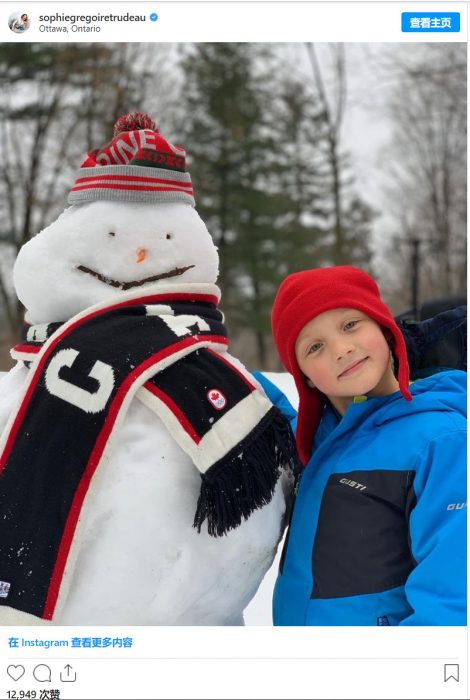 在Instagram的一篇新帖中,杜鲁多妻子苏菲(Sophie Grégoire Trudeau)又分享了他们一家的家庭生活,她贴出了一张Hadrien Trudeau堆雪人的照片。