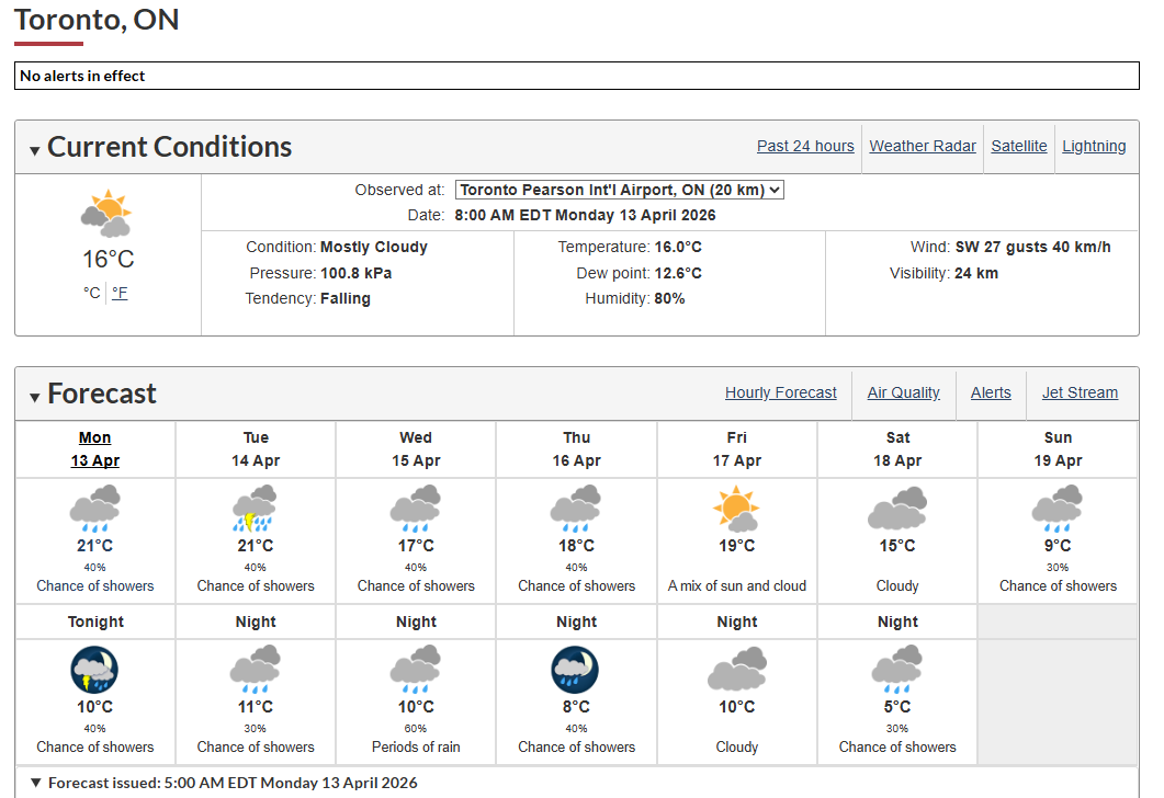 根据加拿大环境部预测,本周大部分时间天色阴沉并伴随潮湿天气,直至周末才有机会短暂放晴。尽管天气欠佳,气温则相对温暖,属本周之“补偿”。