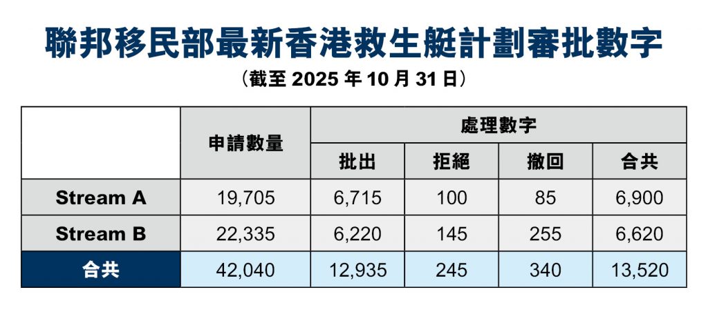 【星岛记者郭颖琳报道】加拿大移民、难民及公民部(IRCC)最新向《星岛新闻网》披露的数据显示,香港救生艇计划 A、B 两个通道截至 2025 年 10 月 31 日,合共接获约 42,040 宗永久居民申请,当中仅处理约 13,520 宗,包括获批、被拒及撤回个案,意味仍有约 28,520 宗申请尚未完成审批。移民部暂未公布 10 月底以后的更新数据,仅表示相关资料属运作性质,仍在处理中,并可能有所变动。
