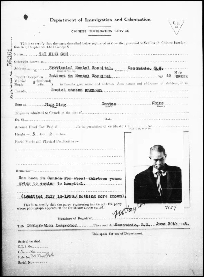 Tai Hing GOM 在疯人院内所获华人注册护照。(CBC)