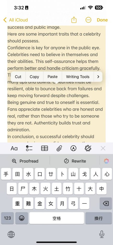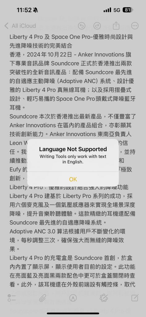 目前Apple Intelligence的写作工具只支援英文,中文应用有待进一步公布。