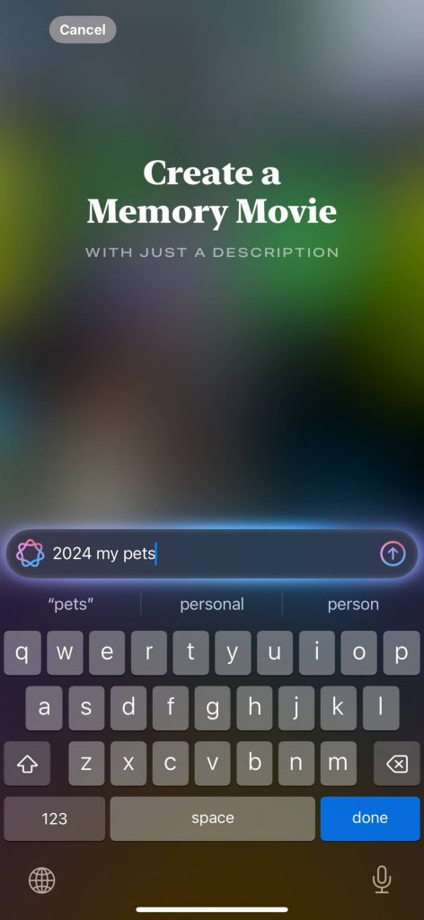 只要相片App打开“回忆”功能,输入简单描述字句,如“2024我的宠物”或“夏天的石澳”,就能让iPhone 15 Pro或iPhone 16自动挑选相关相片或影片,配上背景音乐,生成一段充满美好回忆的幻灯片或短片。