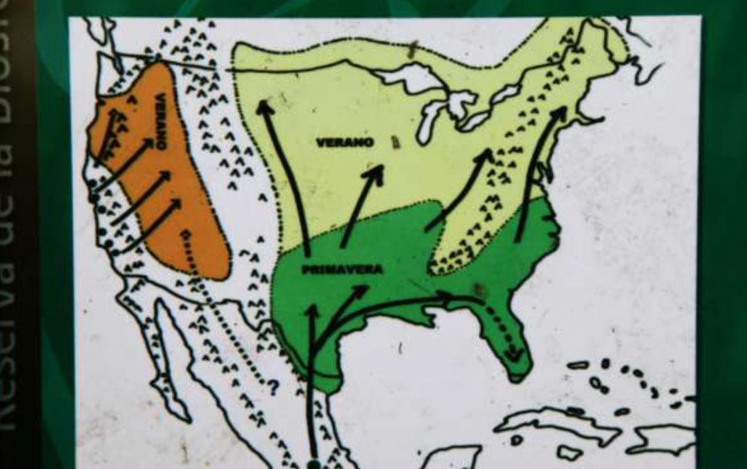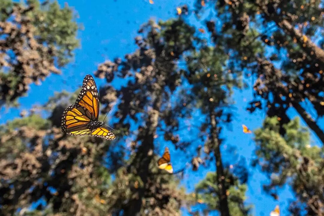 每年深秋至冬天即将来临的时候,它们就从加拿大和美国北部起飞,成千上万地聚集在一起,长途迁徙到温暖的墨西哥冷杉林中过冬。