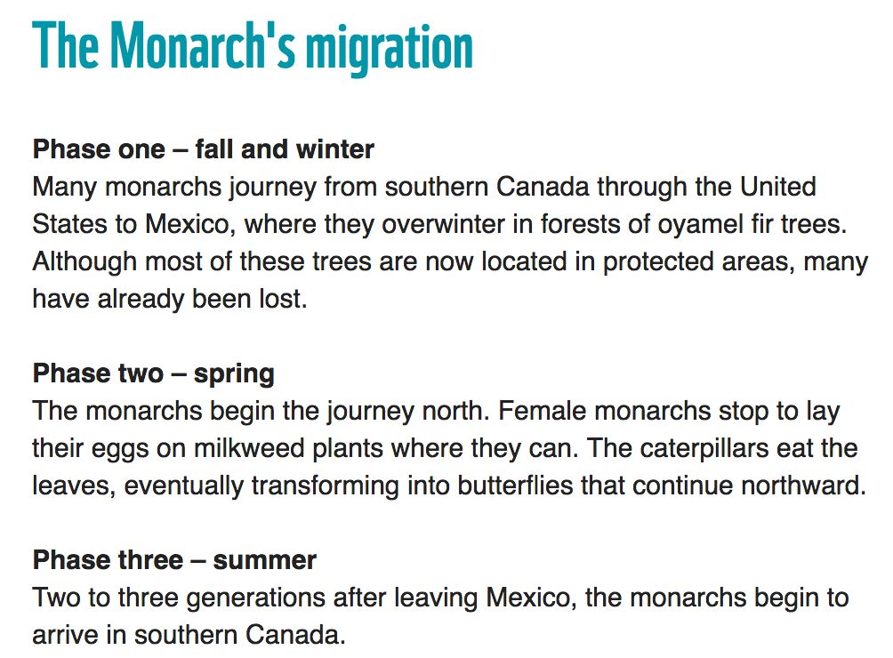 帝王蝶迁徙是为了食物,为了生存及繁衍——也正因为迁徙沿途都有它们的食物乳草(Milkweed),安全顺利地迁徙才有了保证。