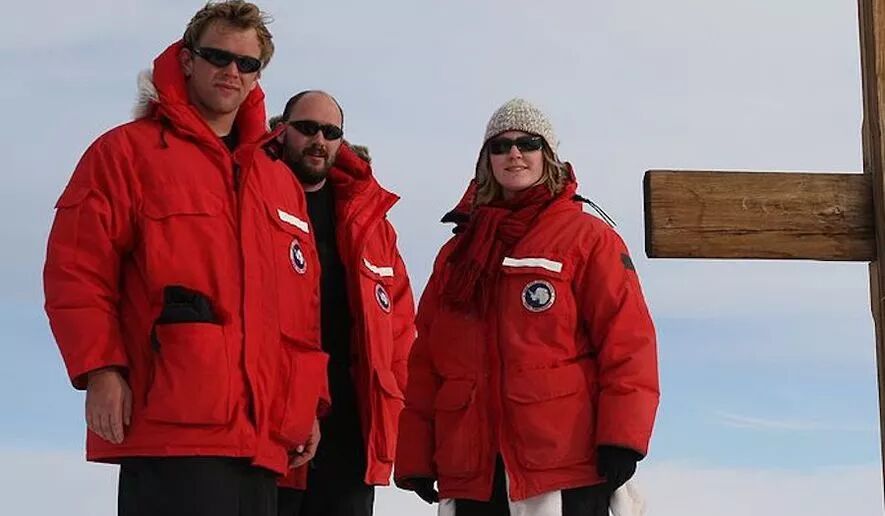美国南极科考队成员在南极观测上上穿着加拿大鹅的外套