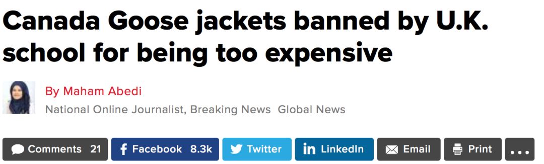 而是因为一所中学颁布了最新规定:学生在校不得穿加拿大鹅的衣服!