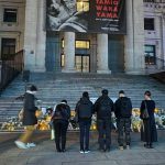 加拿大《星岛》报道,星期日的温哥华美术馆前广场从下午4点起就不断有身穿黑色或素色的人群涌入,许多人携带了一束白花,或是带着只字片语,留在广场前的阶梯上,大家都是为了香港宏福苑大火悲剧而自发性的追思与悼念。