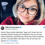 据ABC新闻报道,警方说,33岁的弗洛雷斯周六晚上坐在前排副驾驶座位上,她的男友克里斯托弗·罗德里格斯(Christopher Rodriguez)和她的三个孩子坐在后座。有人从得克萨斯州坦普尔市(Temple, Texas)的一个铁路立交桥上向35号州际公路上扔下了一块大石头。