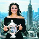 9月8日,安德里斯古在纽约洛克斐勒中心(Rockefeller Center)观景台,手捧美网女单冠军奖杯留影。美联社
