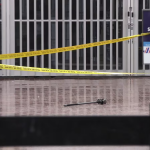 现场影像显示,珠宝店门外地板上有一把大锤,周围被警戒线围住。