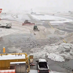 从社交媒体上的影片可见,职员在停机坪上巡视并把雪和水推到一边,让飞机能安全降落。