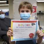 (■■一个魁省男童在接种后展示“勇敢孩子”证书。 加通社)