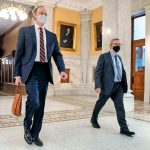 (■■安省首席卫生官威廉斯(右)与新冠病毒科学顾问团共同主席布朗,日前于省议会大楼准备报告。加通社资料图片)