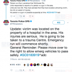 据CP24报道,该名男乘客当时与一名途人交谈,之后有人从附近开了多枪,其中一颗子弹打碎了的士司机旁边的车窗,另一颗子弹则打中司机一边的车门。当的士车窗被子弹打破后,乘客随即叫喊司机驶离现场,的士往央街(Yonge St.)方向开走。