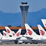 ■中国国航多架客机停泊在北京首都机场停机坪。
